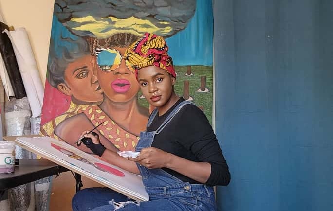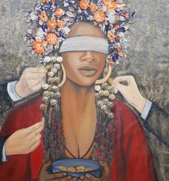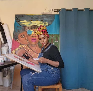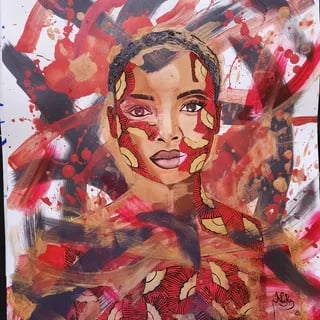 Nukwase Tembo is a Zambian artist based in Lusaka who challenges toxic societal norms and explores the complexities of blackness and women's rights in post-colonial Africa. With a Bachelor of Arts in Fine Arts, she creates mixed media oil paintings and collages that normalize blackness, de-objectify women's bodies, and question how borrowed Western ideals have become rigid cultural standards in fluid African societies. Her work incorporates fabric and recyclable materials to examine what it means to be black and female in contexts where women of color have historically been denied ownership of their own bodies.
